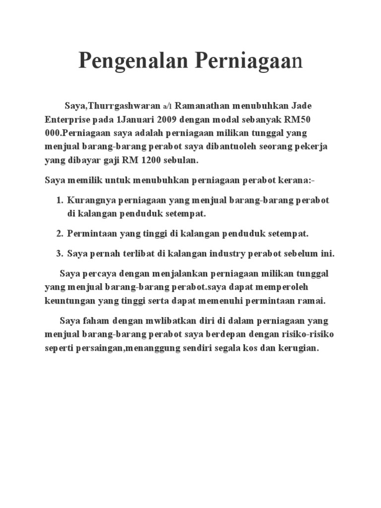 A pengenalan perniagaan saya telah menubuhkan perniagaan perniagaan perabot syeffuzeq yang menjual pelbagai jenis. Saya Arvind al Siralan telah menubuhkan Arvind Entrenue pada 1 Januari 2011 dengan modal sebanyak RM60000Perniagaan saya adalah perniagaan milikan. Pada 1 Ogos 2010 dengan modal sebanyak RM50 000.